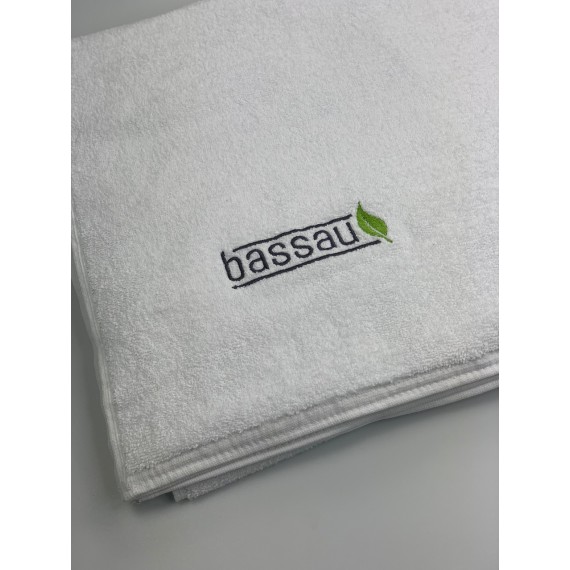 There is an embroidered Bassau logo on the towel.